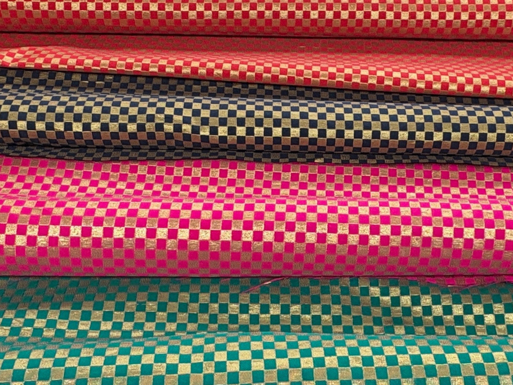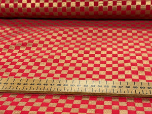 10mm check design featuring a gold metallized yarn in a  carnival-style metallic brocade fabric provides durability and style for multiple applications such as craftwork and theatre/dance production. This strong and visually striking fabric ensures a statement-worthy piece that is sure to be long-lasting.