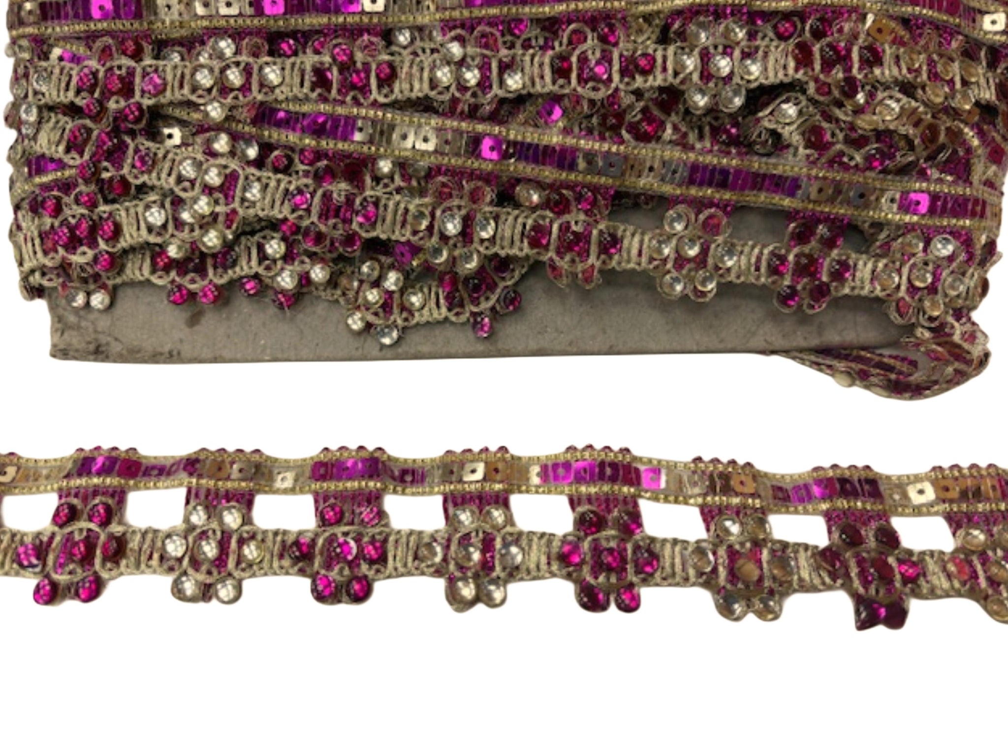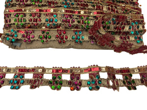 This trim will have a defect, reflected in the price, such as loose sequins and creasing. The handicraft nature of the trim means that any finishing imperfections are not considered flaws.