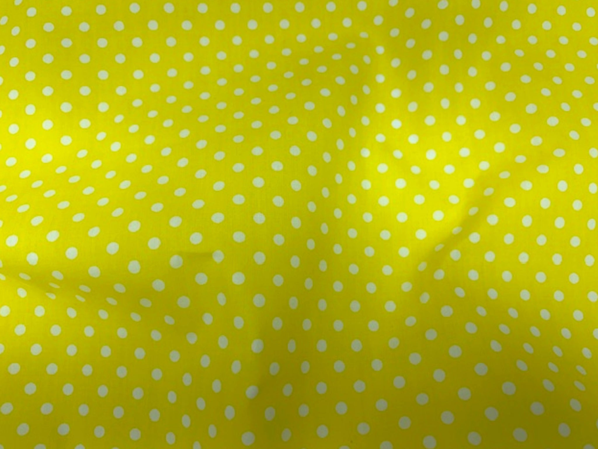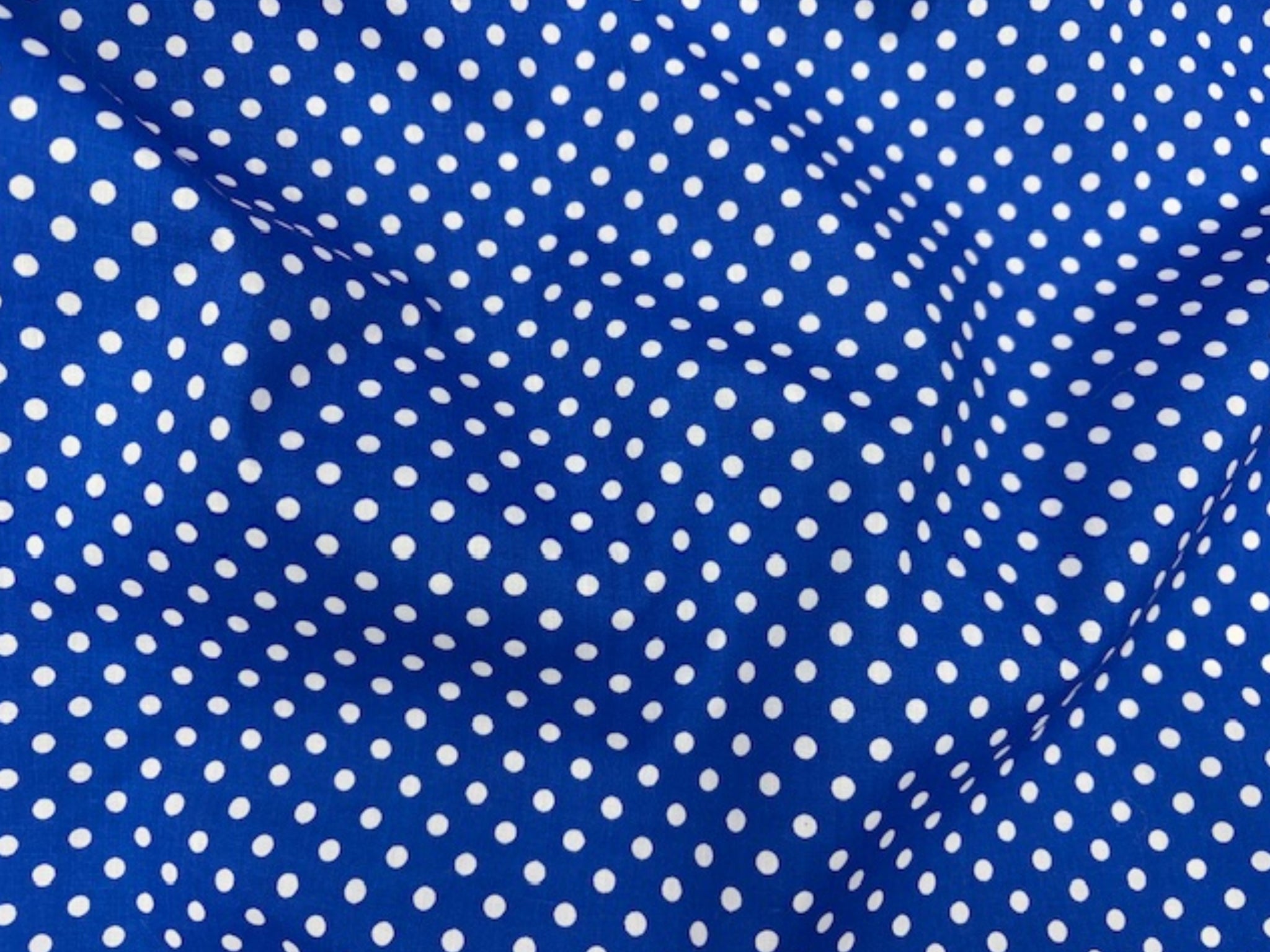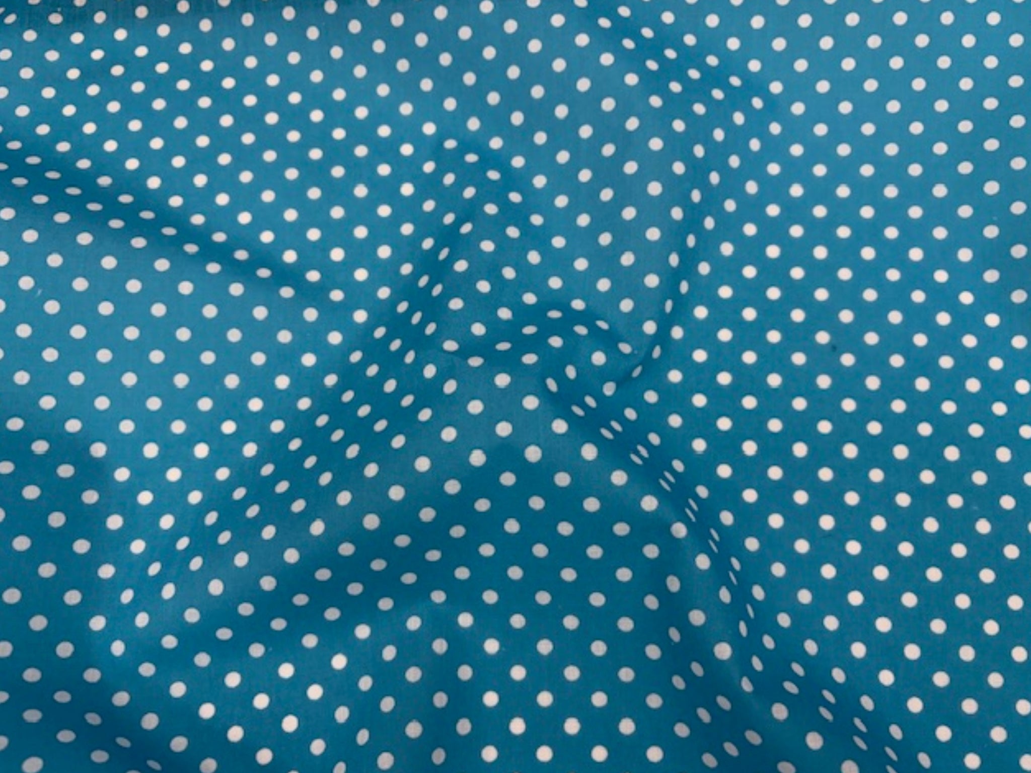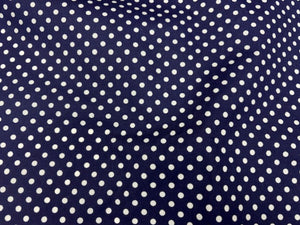 Our lightweight polycotton fabric is a durable yet soft blend of 20% cotton and 80% polyester, offering comfort with added strength. Featuring small polka dots measuring approximately 4–5mm in diameter, this fabric is perfect for creating fun inspired designs.