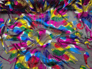 Add instant impact to your designs with this stunning sheer multi foil slinky knit fabric, featuring a bold abstract floral print in vibrant rainbow tones with shimmering foil detailing. This knit fabric is soft, lightweight, and fluid, offering a beautiful drape that flatters the body—perfect for creating standout garments.