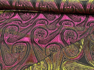 Highly lustrous chinese kimono brocade fabric in a desirable large paisley design. Set on a black background the fabric alternates between two colours depending on the angle it hits the light. This is a two-tone fabric.