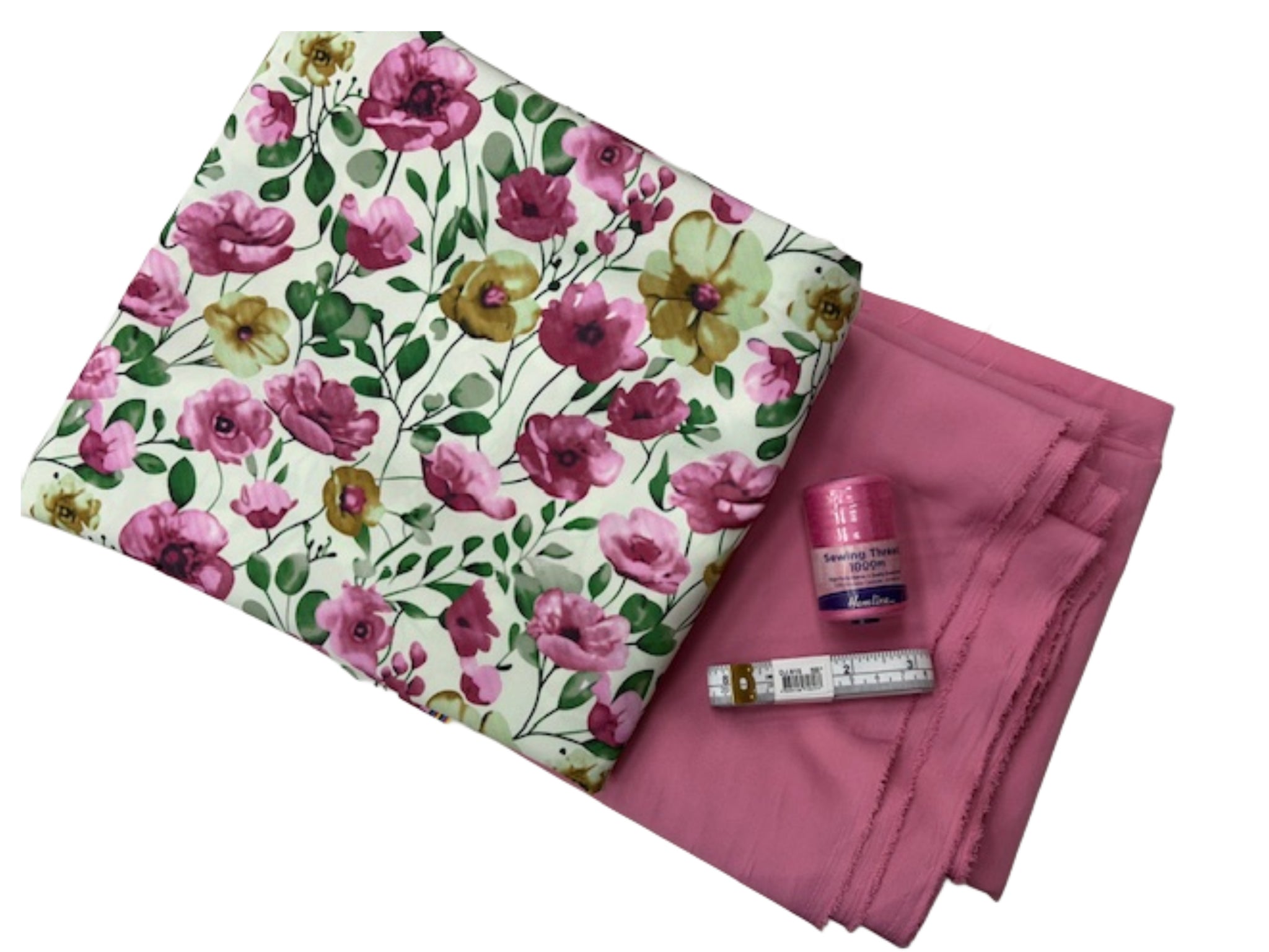 This bundle contains 3 metres each of printed and plain fabrics, totalling 6 metres. The printed fabric is roughly 58" wide, and the plain fabric is about 44" wide. Included are thread and a measuring tape. Please note that these measurements are approximate and may vary slightly. Peachskin fabric has a smooth texture.